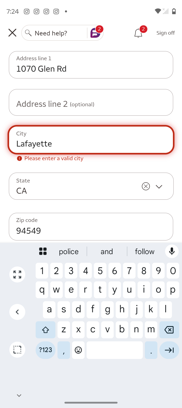 Screenshot: Wells Fargo “invalid city” error when updating address