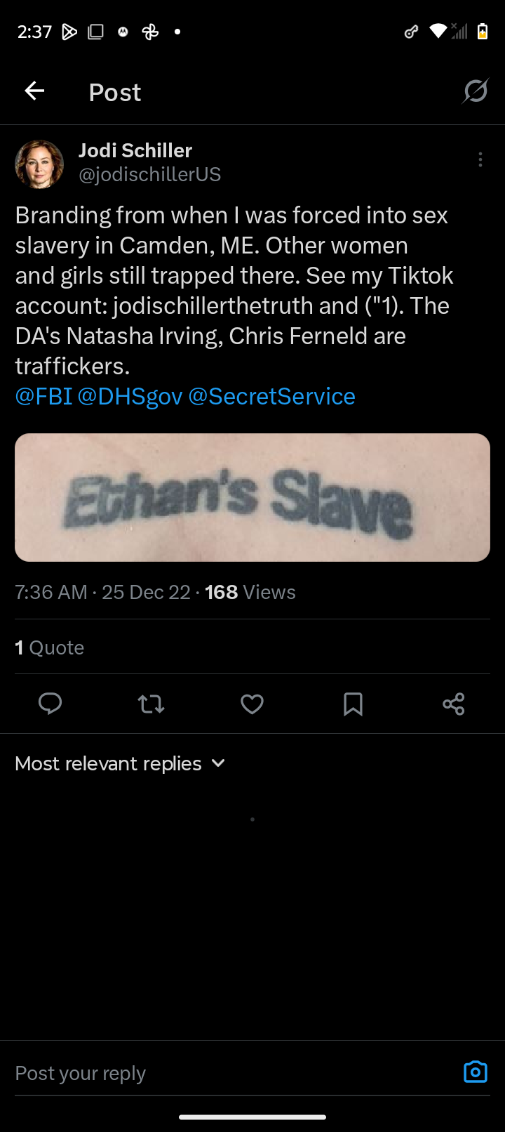 I escaped Maine in 2019, have been calling out for help publicly ever since, and no one has helped me. This is what men are doing to would be female billionaires: forcing us into horrific sex slavery. I have scars on my body from being burned with cigarettes. I have a brand on my back with my perpetrators name. I have a file in Knox county filled with illegal actions by the corrupt DA in Knox county, and one of my rapists, Chris Ferneld.