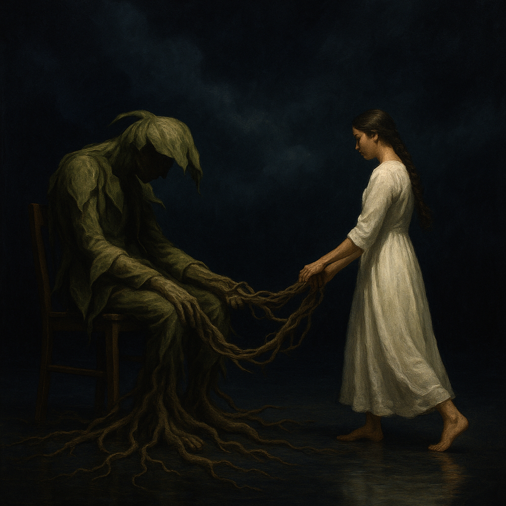 It’s still in progress — raw, ritualistic, part incantation, part testimony — but I want to share it as it grows. What follows is a draft of a 20-minute one-act. Two characters: a woman who used to be a therapist, now a truth-teller, restless and fierce; and a man who embodies a wilted plant. The play is about boxes, resilience, patriarchy, wilt, and the refusal to blame the leaf when the soil is poisoned.