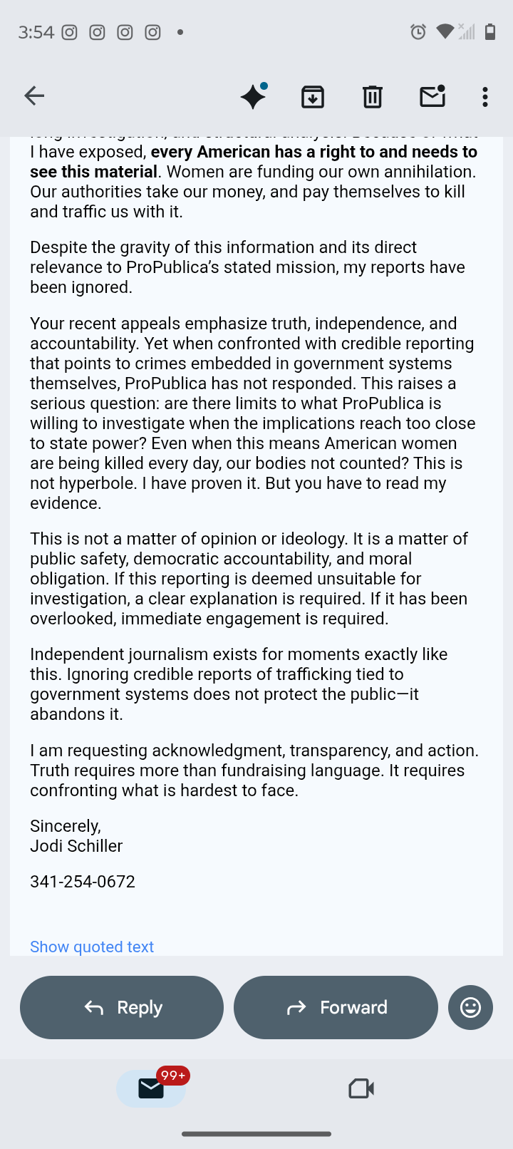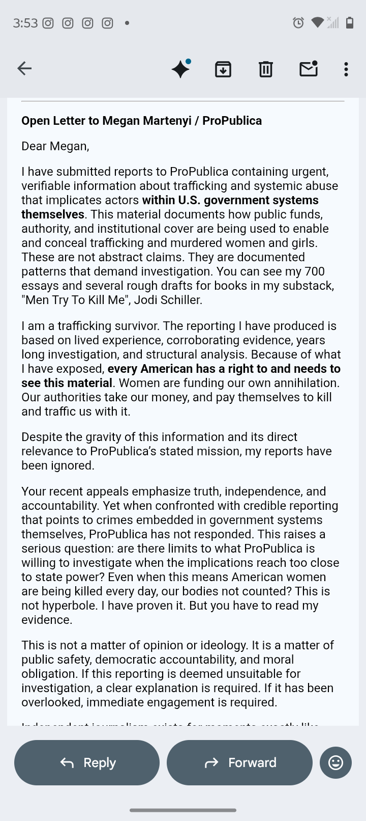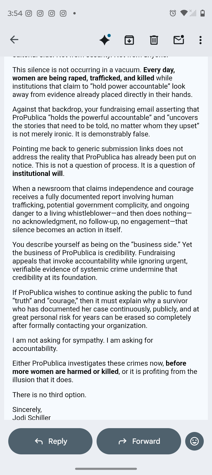 If ProPublica believes in accountability, transparency, and courage, then engagement should not be optional when a survivor brings facts to the table.
